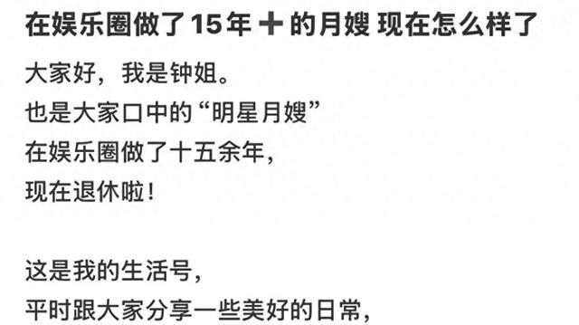 这个钟姐做了15年的娱乐圈月嫂,还担任过杨颖,杨子姗,佟丽娅等明星的孕产营养,所以在娱乐圈还是比较有名气的月嫂,她注册账号后也有好多人关注。